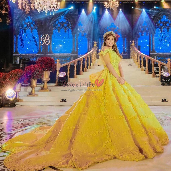 2019 Long Beauty Princess Yellow Ball Gown Quinceanera Dresses 3D Flower Appliques Backless Prom Party Gowns Court Train Evening Wear