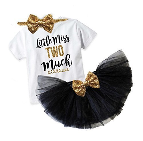 This trendy Little Miss Two Much black and gold Second Birthday Girl outfit is perfect for your little girls special day or all year round!