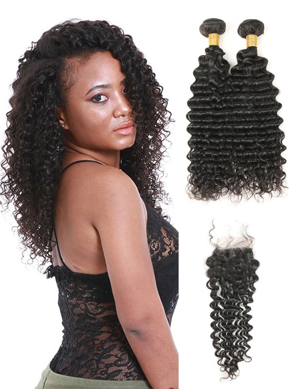 2Pcs Real Human Hair Deep Wave Virgin Hair Weaves with Closure