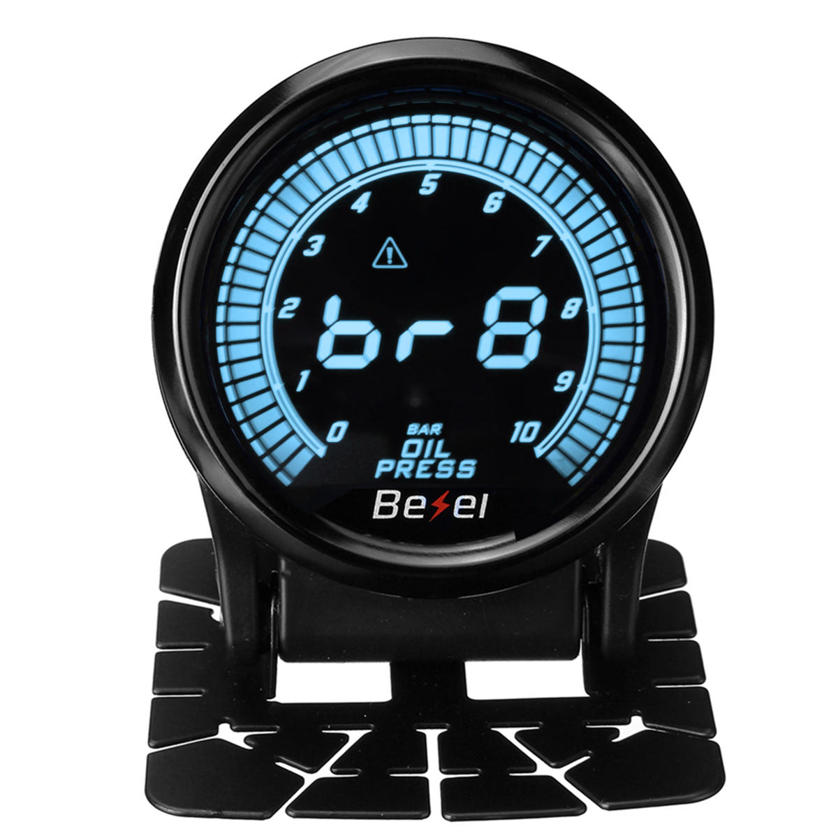 12V 2 52mm Car Oil Press Gauge Meter Digital LED Display With Sensor 0-10BARSpecification:Model Number: B18334Product Name: 2 52mm Oil Press GaugeMaterial: AluminumHousing Color: BlackFace Color: BlackVoltage: 12VDiameter Size: 2 (52mm)Unit :BarReading Range:0-10BARSensor Thread Size : 1/8 NPTStyle :Digital LED ReadoutFeatures:-2 (52mm) diameter gauge.-Black dial face when ignition is off.-10 colors backlights can be selected, and it can memory the setting in the both daytime and night mode.-Brightness can be selected in 6 different levels, and it can memory the setting in the both daytime and night mode.-3 buzzer types can be selected.-4 buzzer levels can be selected.-3 different open ceremonies can be selected.-A warning value (arbitrary) can be set and the warning buzzer can be selected from three variations or turn off.-3 different types indicator movement can be selected.-Data obtained during driving (peak value and warning value) can be stored up, and the peak value can be reviewed and cleared.Common Button Operation:1.There is a button in the backside of the gauge, the remote button is included.They are used to review and clear peak value,change the colors, adjust the brightness, choose the buzzer, set the warning etc.The remote button is same function as the button in the gauge.2.Short press to switch between different functions settings,long press until buzzer sounds, then enter the setting mode.It will return to normal status when the button is released after 5 seco
