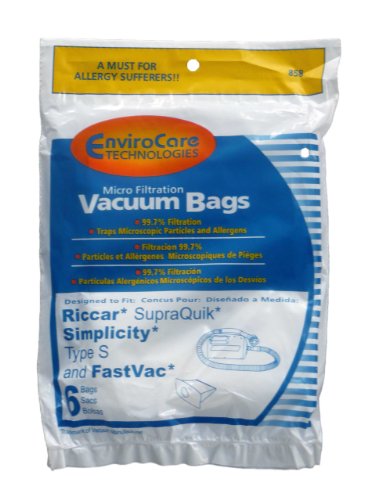 6 Allergen Bags for Riccar, Simplicity Type S, Eureka W, Fast Vac, GE, Compact Canister Hand Held Vacuum Cleaner #858, replaces Simplicity #SS-6 and Riccar part #RSQ-6, Sport, S100, FV500, FV-500, AC DELCO 550, SQuick Supra Quik, SupraQuik RSQ1