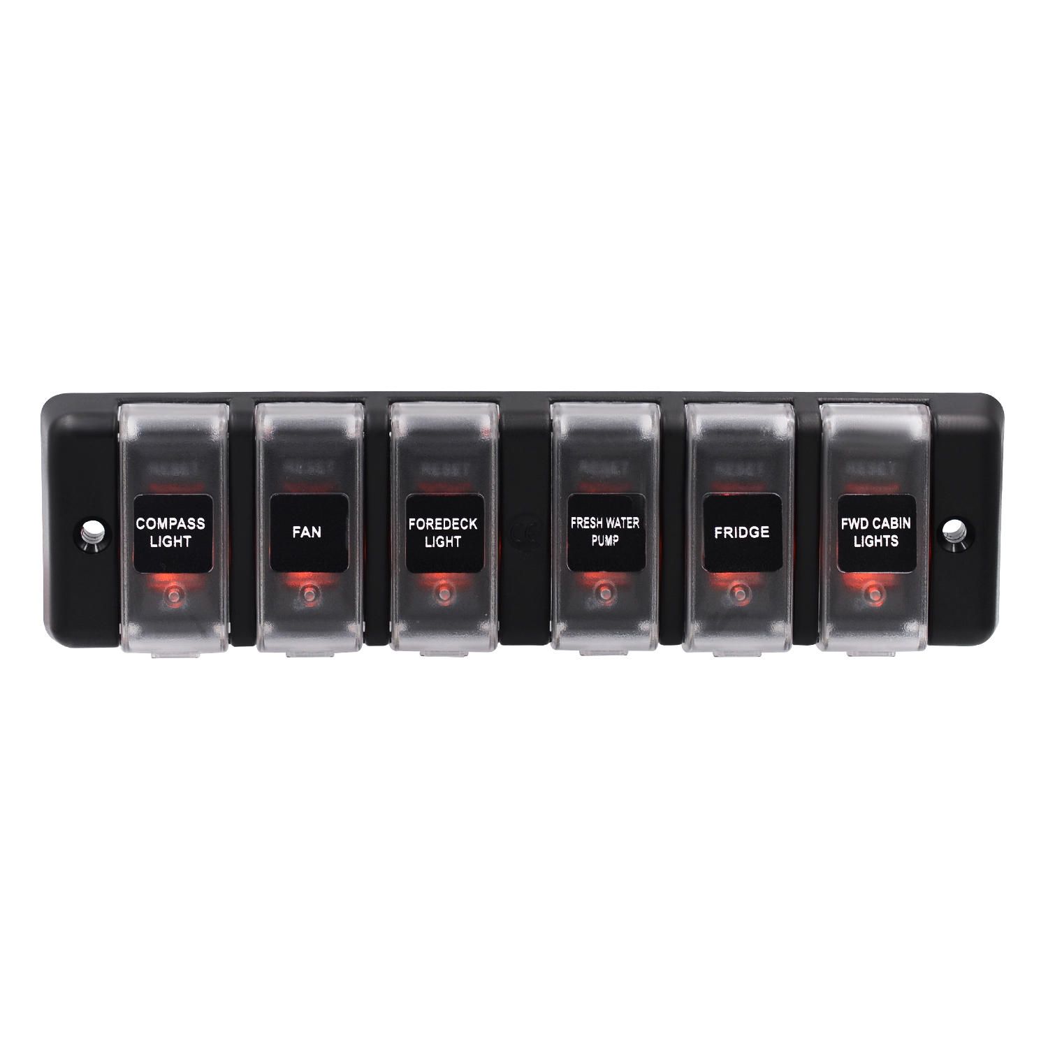 Feature:6 groups switch panel with pre-wired connectors and fuses, overload protection and safety to use.One key switch, convenient and quick.Each switch with protective cover, it is waterproof.Environmental protection and flame-resistant materials, durable and corrosion resistant.Universal fit for 12V cars, RV, caravans, trailers, boats, yachts, marine etc.Specification:Material: Environmental Protection Flame Retardant Nylon MaterialColor: Black + RedInput Voltage: 12V DCProduct Switch Function: RESET/OFFOutput: 16A 12V DCSwitch Group: 6 GroupsProduct Size: 50 x 70 x187mm/ 2 x 7.4Mounting Hole Size: 37 x 150mm/ 1.5 x 6Package Included:2 X Screws