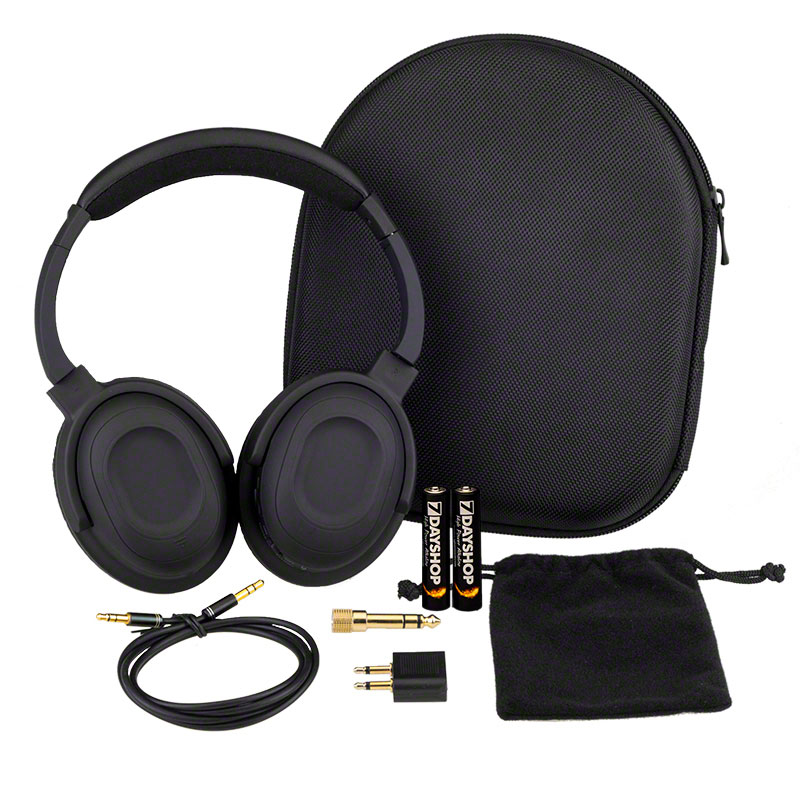 Extra Value accessories and case included (see box contents below). Really superb sound quality with larger HQ 40mm driver speakers to ensure a really solid bass and detailed treble. The powered active noise suppression/isolation technology system reduces incoming noise to an absolute bare minimum (reduction of up to 85%) and will provide improved listening quality with less user distractions. Ultra comfortable and super soft ear pads also provide good in/out noise insulation too, just wearing them is a revelation!Especially ideal for noisy environments like aeroplanes, trains, public transport and even busy workplaces etc. these 7dayshop headphones will work and connect with all popular MP3 players, mobile phones and most electronic equipment including your laptop and PC etc.Also ideal for use with Electric Instruments! Using the adapter kit, these headphones should plug into most amplifiers, Keyboards and music desks/mixers! Listen to your own music in supreme quality! Even with the volume on high there will be no more complaining neighbours, house mates or parents!Uses the standard 3.5mm headphone jack so will work and connect with your Apple iPhone, iPad and iPad Mini, iPods, Samsung Galaxy, Nokia Lumia, HTC, Sony Xperia, Google Nexus, Tablets, Kindle Fire, PC Computer and Laptop, DVD player and many TV’s etc. etc.These superb headphones also feature close fit ear pads which reduce noise levels both ways so that you can listen to loud music without others hearing. The lightly padded adjustable headband will easily fit most heads and is super -comfortable for long term use. There is a volume adjustment on the side of the ear cans and the noise suppression system may be turned on/off there also.More great news for travel: The ear cans rotate inward 90 degrees so the headphones will store in a slimmer profile case (included – see contents list below) and so will take up less space upon storage/traveling. Specifications: Transducer type: DynamicDriver size: 40mmFrequency range: 30-20,000HzImpedance: 32ΩPower output: 100mWNoise attenuation: Max 20dBDistortion: Less than 1%Connections: 3.5mm stereo jack, supplied with 1.5M detachable cable (see box contents below)Power supply: 2 x AAA (included)Weight: 180 or 196 grams with batteries fitted in case 400 grams What’s in the Box?7dayshop Aero 7 Noise cancelling headphonesLonger 1.5 Metre 3.5mm to 3.5mm connection cable (with Gold plated connectors)3.5mm to 6.3mm phono adapter (with Gold plated connectors)3.5mm to Dual-plug airplane adapter block (Gold connectors)Tough and protective EVA slim-line travel case with wrap around zip (Case Measures: H21 x W18 x D5cm)Velveteen Drawer-string carry pouch for holding cable and adapters (Measures 11x9cm)2 x AAA / LR03 Alkaline BatteriesTo Change the batteries – slide off the cover on the left earphone – simple and quick!  Please buy this 7dayshop product with complete confidence: 7dayshop have been selling photographic, digital, battery, computer and audio products online since Year 2000. 7dayshop Aero 7 headphones are also supplied with a 1 year warranty too!