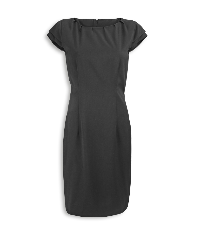 Short double capped sleevesScoop neckline with gatheringConcealed centre back zip fasteningStretch liningTeflon coated fabric for stain resistance200gsm 77% polyester/21% viscose/2% elastaneUp to 40 washSizes 6 – 26Length graded by size from 37 – 40ins