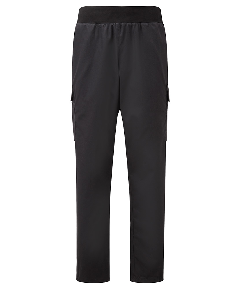 Unisex fit Wide stretch jersey waistband Jersey side hip panels for increased comfort and ease of movement Two side hip pockets Two side leg cargo pockets with pocket flaps Pen and mobile phone pockets on left hand side cargo pocket One rear patch pocket Tea towel loop with stud Main fabric: 195gsm 65%/35% cotton jersey waistband and panels: 340gsm 70% viscose/25% polyamide/5% elastane Up to 60° wash Sizes XS – 4XL Inside leg: Regular (R) 31ins Extra tall (A) 35ins