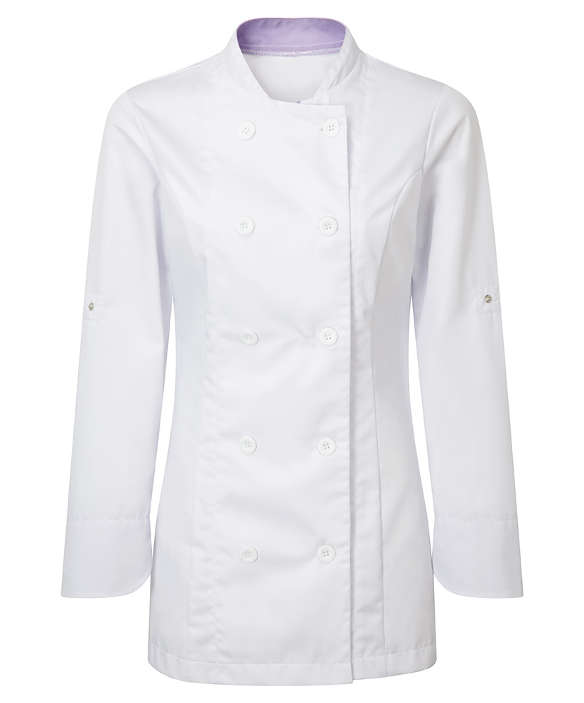 Flattering female fitMandarin style stand collarDistinctive contrast lilac inner collar cuff facing and centre front edge pipingRoll up sleeve with stud tab fastening215gsm moisture wicking fabric 50%cotton/50% polyesterUp to 60° washSuitable for industrial laundrySizes XS – 2XLCentre back length: 74.5 – 81.5cm (increases with size)