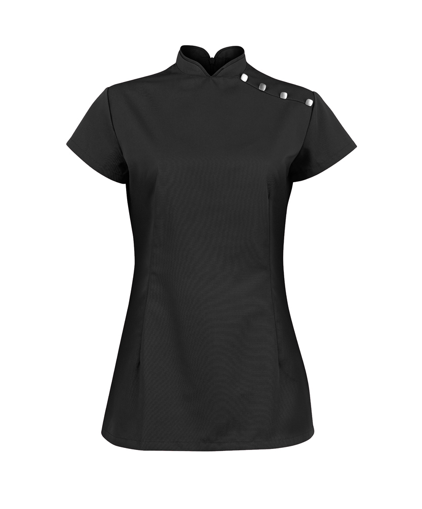 Mandarin style stand collar4 square silver button detail on shoulderConcealed back zipSide vents195gsm (Bright pink 210gsm) 65% polyester/35% cottonUp to 60° washSizes 76 – 136cm (bust measurements)Back length 73 – 78cm (increases over size)