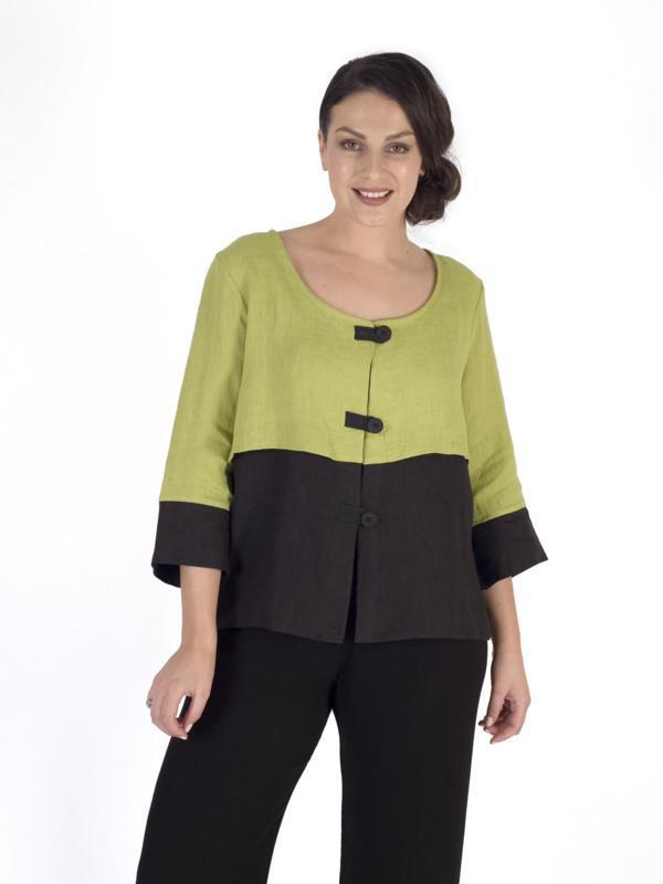 Colour block linen jacket with three button and loop fastening. High low shape with extra black border on the back hemline. to give coverage . Stunning with black slimline pull on trousers or even with our fine rib flares.