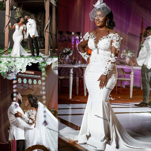 Arabic Aso Ebi Mermaid Wedding Dresses Illusion Long Sleeve Sheer O-neck Lace Floral African Plus Size Court Train Bridal Dress