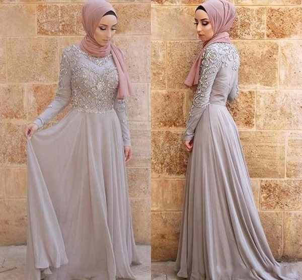 Arabic Elegant 2019 Muslim A-Line Prom Evening Dresses Lace Applique Beaded Long Sleeves Formal Dresses Long Evening Party Gowns
