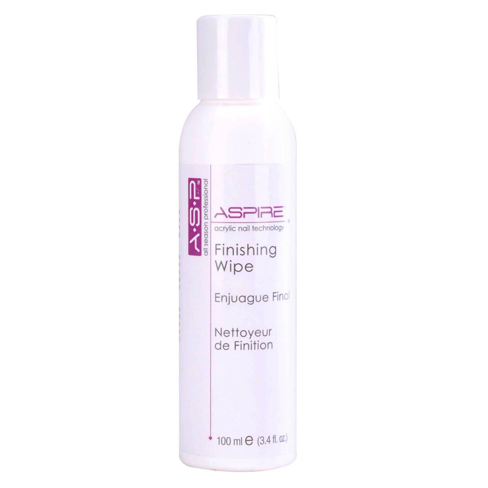 Finishing Wipe fluid from ASP, designed to aid the fast and easy removal of sticky residue from UV gels. Also useful for cleaning brushes. Pack size 100ml.