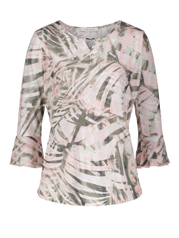 Ultrasoft burnout jersey in a tropical palm print. Keyhole neckline with silver-tone tab detail, plus ¾ sleeves with frilled cuffs.