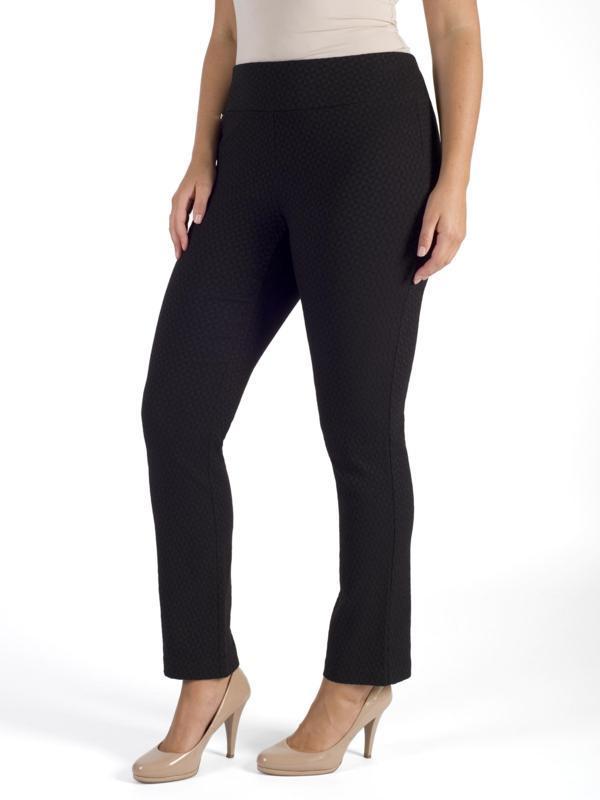 Black slim leg pull on stretch trouser with allover geometric jacquard pattern.