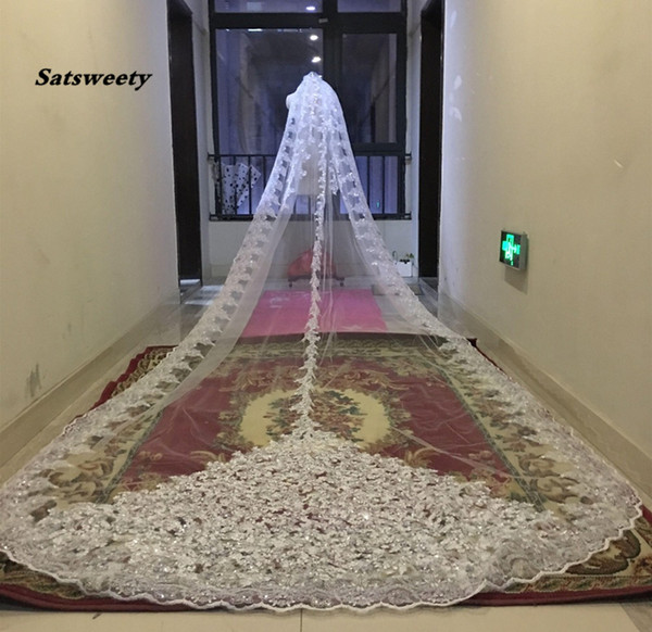 Bling Bling Sequins Beads Cathedral Bridal Veils Appliques Lace Edge Crystals 1T With Comb Attached Custom Made Long 5 M Wedding