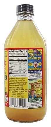 Bragg Organic Raw Apple Cider Vinegar is made from delicious, healthy, organically grown apples. Processed and bottled in accordance with USDA guidelines, it is Certified Organic by Organic Certifiers and Oregon Tilth; and is Kosher Certified. Bragg Organic Raw Apple Cider Vinegar is full of zesty Apple Cider Vinegarnatural goodness. Non-GMO Certified. It�s a wholesome way to add delicious flavor to salads, veggies, most foods, and even sprinkle over popcorn. Apple Cider Vinegar has been highly regarded throughout history. In 400 B.C. the great Hippocrates, Father of Medicine, used it for its amazing health qualities.Certified Organic Bragg Organic Raw Apple Cider Vinegar is unfiltered, unheated, unpasteurized and 5% acidity, and contains the amazing Mother of Vinegar.