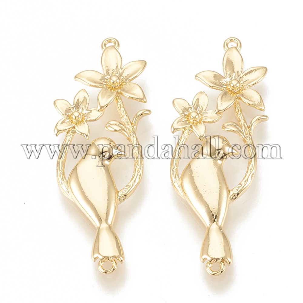 Brass Links/Connectors, Bird with Flower, Real 18K Gold PlatedSize: about 36.5mm long, 13.5mm wide, 2.5mm thick, hole: 0.5mm.