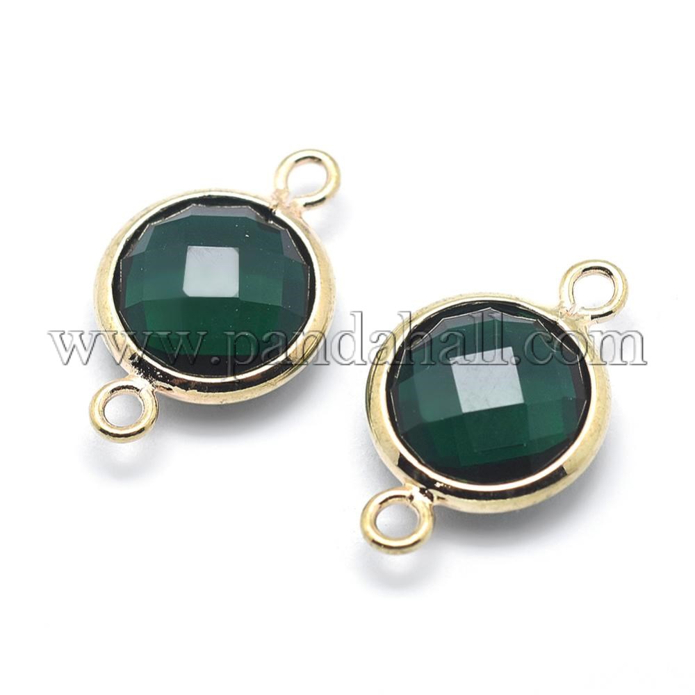 Brass Links, with Faceted Glass, Flat Round, Lead Free & Cadmium Free, Golden, DarkGreenSize: about 14mm long, 9mm wide, 3.5mm thick, hole: 1mm.