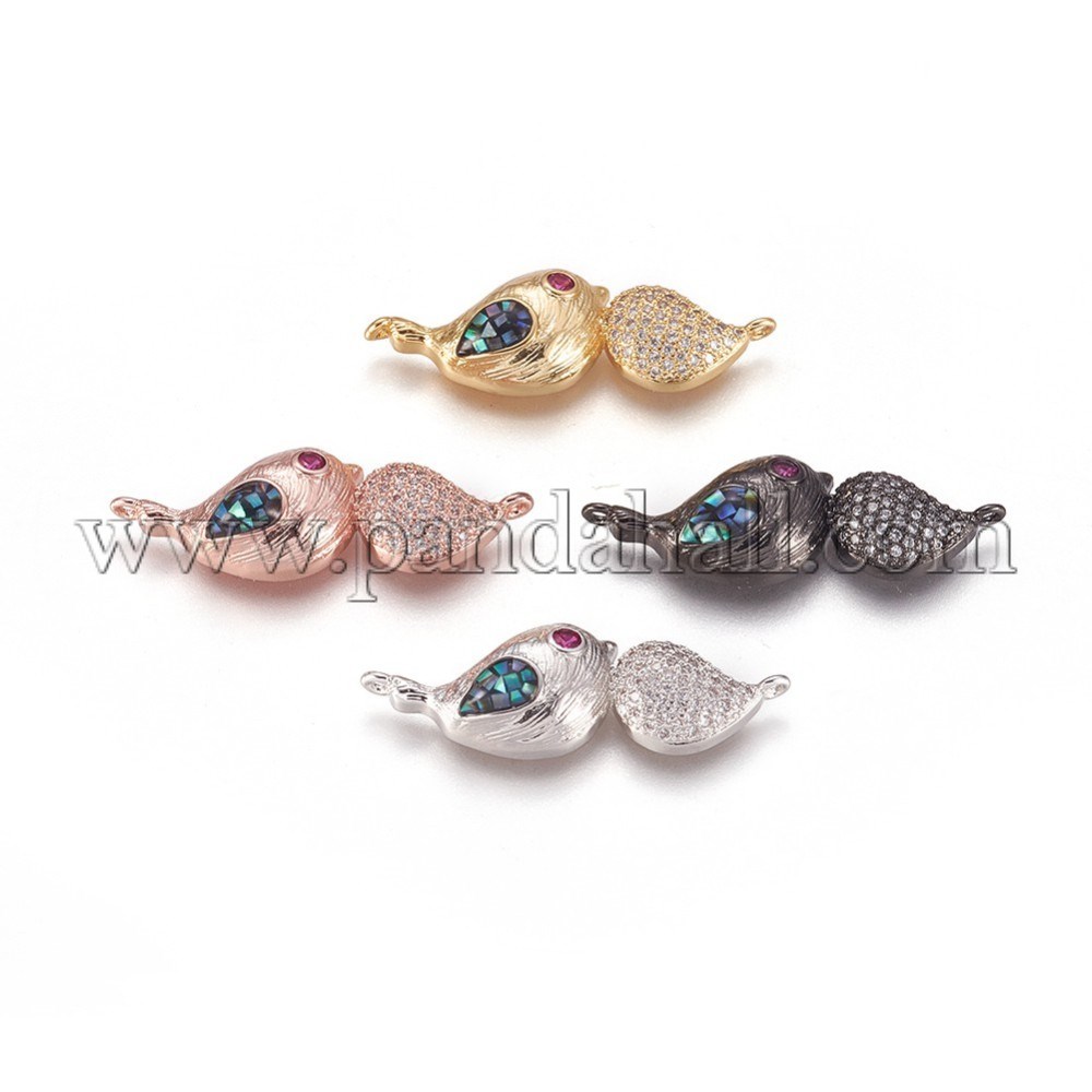 Brass Micro Pave Cubic Zirconia Links, with Abalone/Paua Shell, Bird, Colorful, Mixed ColorSize: about 34mm wide, 12mm long, 6.8mm thick, hole: 1.2mm.