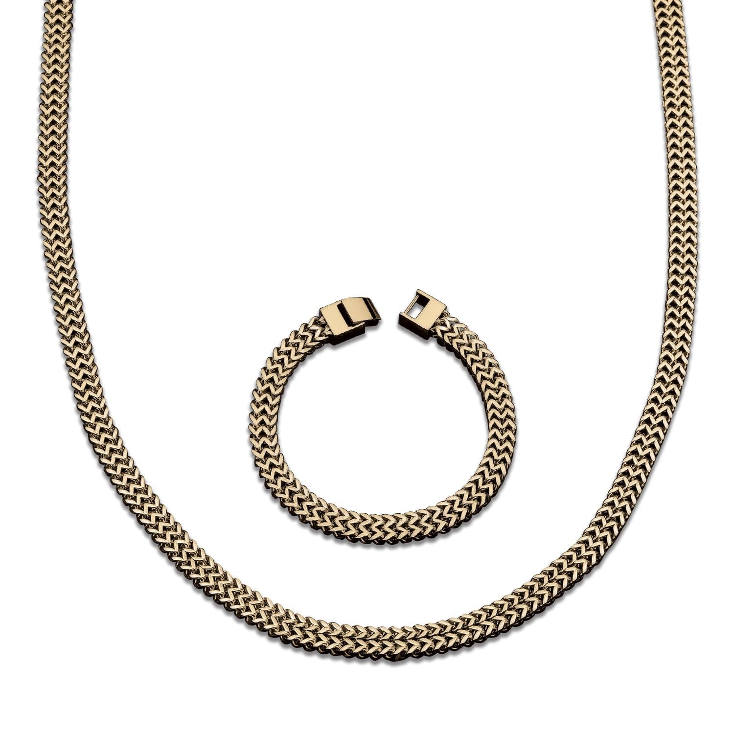This collection is composed of designer intertwined link to enable it to lie flat against your chest, and the fluid comfort fit on the bracelet around your wrist. Crafted from premium stainless steel and plated in 18k yellow gold for a luxurious finish. The clasps blend effortlessly into the chain to form a feature, as well as security. This piece makes a wonderful gift or as a smart present for yourself.