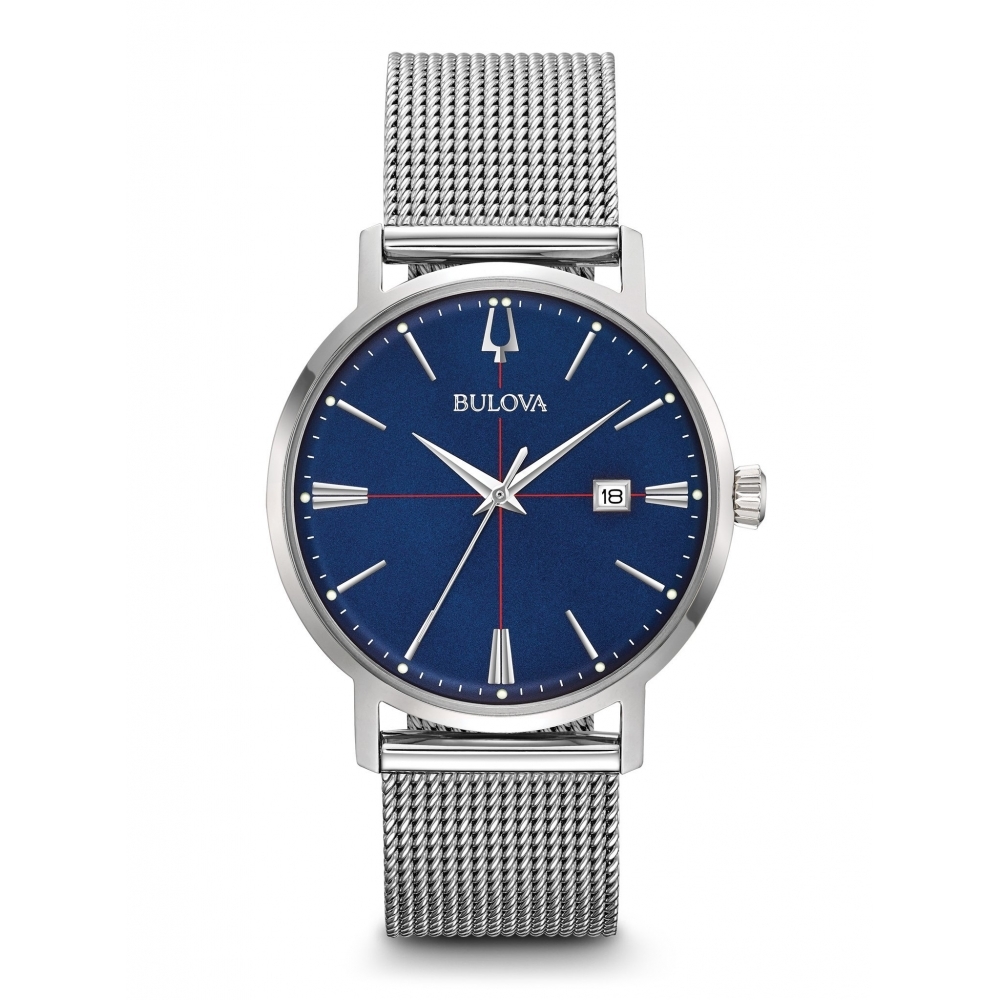 FACE SHAPE – Round FACE COLOUR – Blue BAND TYPE – Mesh Strap BAND MATERIAL – Stainless Steel MOVEMENT – Quartz CASE – Stainless Steel CRYSTAL – Mineral FEATURE – Date DIAL TYPE – Analogue CONSTRUCTION – 30m/100ft (3 ATM) DIMENSIONS – Case Diameter: 39mm Case Thickness:10 mm From the Classic Aerojet Collection. In stainless steel, deep blue dial with silver-tone accents and three-hand calendar feature, box mineral glass, stainless steel mesh bracelet with double-press deployant closure, and water resistance to 30 meters.