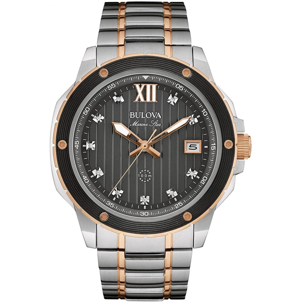 Item Shape – Round Dial window material type – Mineral Display Type – Analogue Clasp – Fold-over-clasp-with-double-push-button Case material – Stainless steel Case diameter – 47 millimeters Case Thickness – 15 millimeters Band Material – Stainless-Steel Band length – Men’s Standard Band width – 22 millimeters Band Colour – Silver/Rose Gold Two Tone Dial colour – Black Bezel material – Stainless steel Calendar – Date Special features – Seconds hand Movement – Quartz Water resistant depth – 100M Make a splash with this stylish timepiece from Bulova’s Marine Star Collection The black dial features a date window, rose gold-tone detailing, crystal hour markers and luminous hands Additionally, the durable rose gold/silver two tone bracelet features a fold-over buckle closure for added security. Domed mineral crystal, screw-back case and a Quartz movement