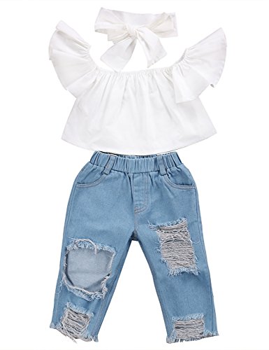 CaNIS 3pcs Baby Girls Kids Off Shoulder Lotus Leaf Top Holes Denim Jeans Headband Outfits Set (1-2Y, White)