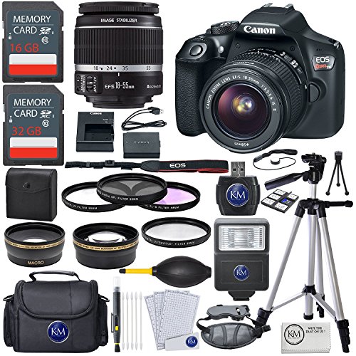 Bundle Includes: 32/16GB SD Card, Wide Angle mm Lens, 2x Telephoto Lens, Carry Bag, 3 Section 59″ Tripod (with case), 3 Piece Filter Set, 58mm UV Filter, Slave Flash, Fiber Cloth, 3Pc Cleaning Kit, 2 Screen Protectors, Dust Blower, Lens Cleaning Pen and Memory Card Case.