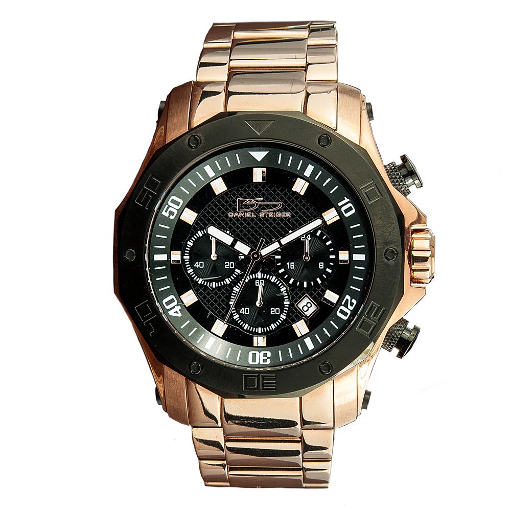 No disrespect to our hardworking photographers but our watches look even better in real life. Members of staff from Daniel Steiger HQ have travelled all over the world wearing our timepieces. They are often stopped, even by airport customs officials to ask about where they got their amazing watch. If they choose to play the ‘how much do you think’ game, most people guess in the thousands. Solid premium grade stainless steel is fused with Rose Gold and IP black. The designer multi layered dial hides a precision quartz movement with 24 hours and chronograph subdials. Magnificent presentation case included.