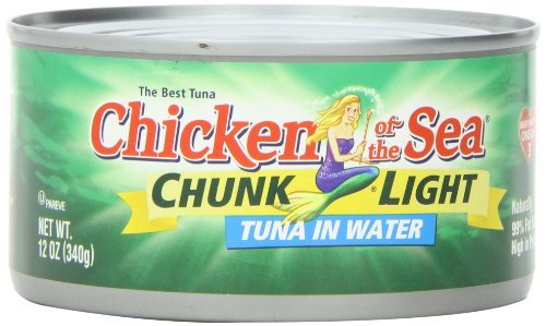 Chicken of the Sea Chunk Light Tuna in Water consists of prime skipjack and yellowfin tuna with a mild flavor, pleasing texture and appearance. Low in fat (0.5 grams of fat per serving), light meat tuna is considered an excellent source of protein for a great price.Pack of twenty four, 12-ounce per can (total of 288 ounces)