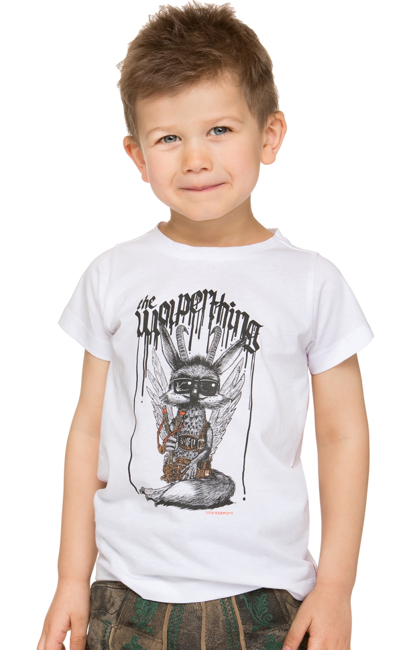 Wolpiboy t-shirt for traditional Bavarian boys from Stockerpoint in white. The traditional shirt in high quality convinces with its unique “Wolpertinger” print. Do you already know? Wolpertinger are usually only seen at midnight. The stylish “designer print” ensures the cool look and puts it perfectly in scene. The ideal combination partner for jeans and leather trousers