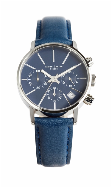 Trendy smaller diameter chronograph in blue with three inner dials for event timing up to a maximum of 60 minutes, plus 24 hour clock. The bottom dial measures event seconds, the top left dial measures event minutes and the top right dial is the 24 hour clock. The main minutes and hours hands are luminous and the main seconds hand is extremely fine and needle-like. It has a date window too. Case diameter is 35mm, case depth is a generous 10mm. Genuine ‘Simon Carter’ branded padded leather strap is 18mm wide. Water resistant to 3ATM