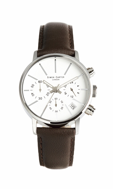 Trendy white face smaller diameter chronograph with three inner dials for event timing up to a maximum of 60 minutes, plus 24 hour clock. The bottom dial measures event seconds, the top left dial measures event minutes and the top right dial is the 24 hour clock. The main minutes and hours hands are luminous and the main seconds hand is extremely fine and needle-like. It has a date window too. Case diameter is 35mm, case depth is a generous 10mm. Genuine ‘Simon Carter’ branded padded leather strap is 18mm wide. Water resistant to 3ATM