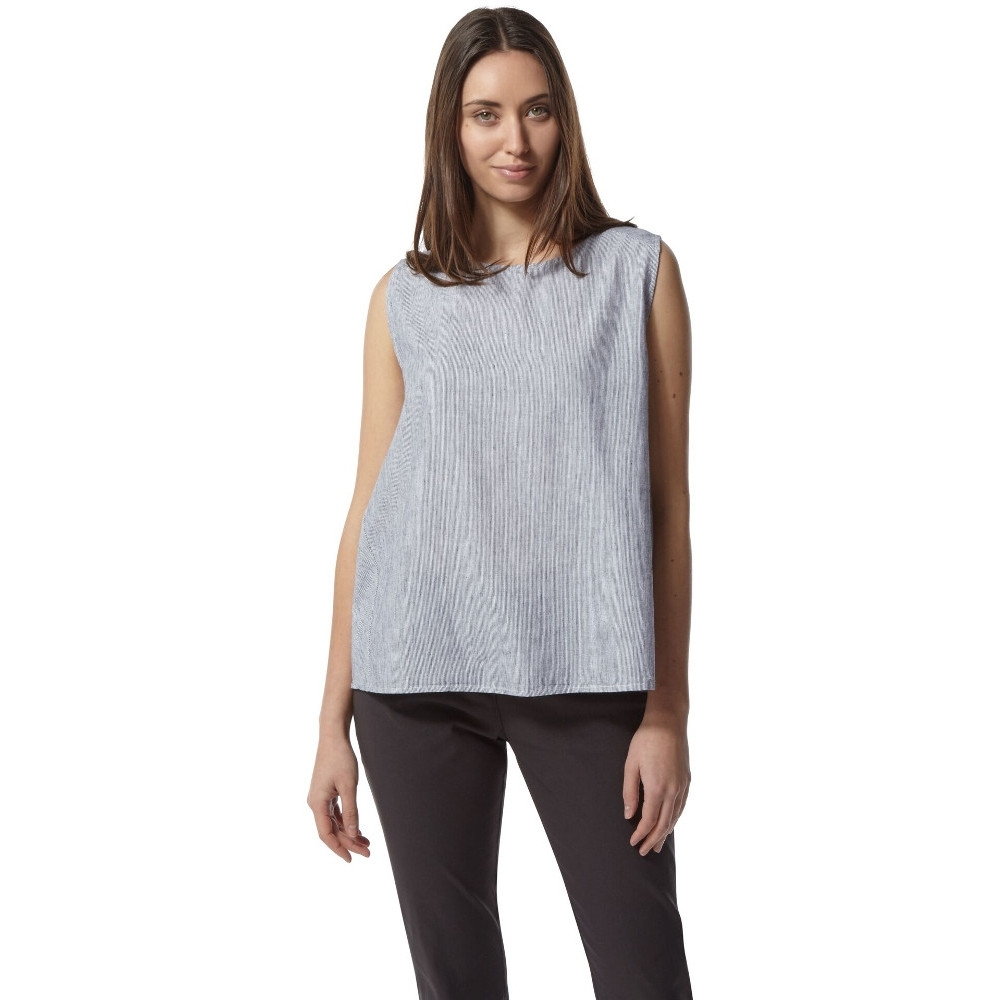 Amp up your outdoor look with this Craghoppers Women’s Martina Summer Walking Vest. The combination of soft cotton and versatile striped linen fabric makes it lightweight and practical for everyday wear during summer. Its back features a button for style. This comfortable outdoor clothing piece is easy to care., Outdoor Protection Clothing., Lightweight., Easy Care.