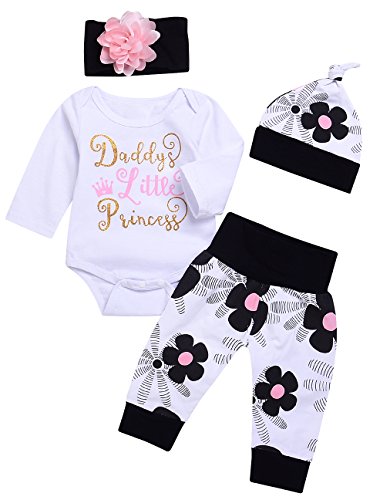 Cute 4PCs Newborn Kids Baby Girl Daddy Little Princess Romper + Flowers Pants + Hat + Flower Headband Winter Outfit (White, 3-6Months)