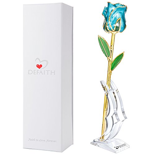 DEFAITH Pearl Teal Blue Fresh Cut 24K Gold Rose w/Stand – Great Valentines Day / Anniversary / Mothers Day / Birthday Gift for Her Women Mom Wife Girlfriend
