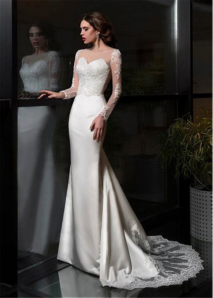 Designer 2021 New Elegant Satin Bateau Neck Sheath Wedding Es with Lace Appliques Train Long Sleeves Bridal WF62