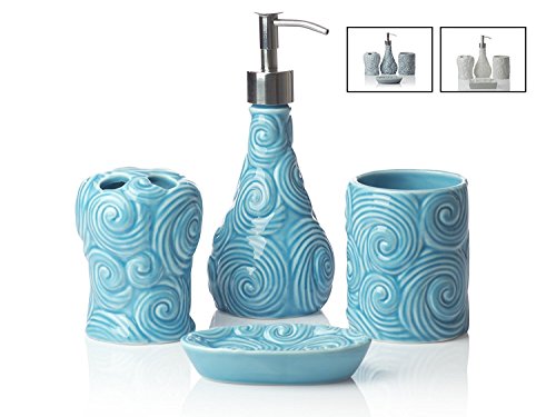 Designer – 4 Piece Bathroom Accessories Set | With Soap or Lotion Dispenser, Toothbrush Holder, Tumbler and Soap Dish | Glossy Finish | Porcelain (Ocean Waves, Aqua Blue)