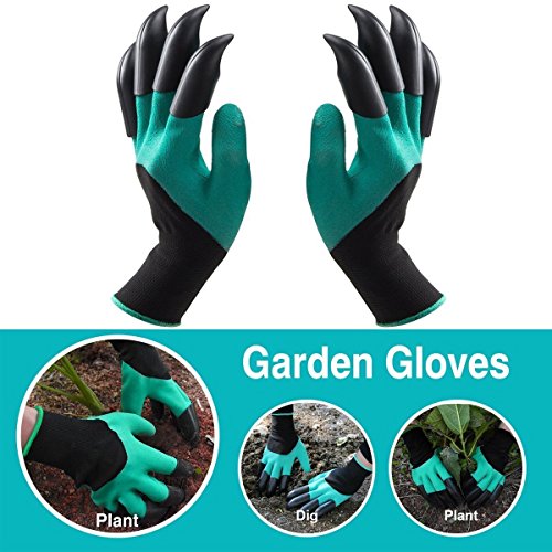 Features: – Protection of a glove with the efficiency of gardening tools. – Built-in gardening claws make digging, planting, raking, fast and easy. – Durable non-slip construction protects hands while preventing broken fingernails and sore fingertips. Puncture resistant design shields against sharp & thorny greenery. – Garden gloves rinse clean and don’t hold dirt leaving your hands dry, clean & protected. – They fit tight around your wrists which really helps make up for the extra room In the glove. Material: Polyester + Rubber Latex + ABS Plastic Color: Black + Green Size: One size fits mostQUICK & EASY TO PLANT – 4 ABS plastic claws on LEFT & RIGHT GLOVE. (Value of 2 pairs in one!) All 8 claws have been attached with an environmentally friendly adhesive. Easy solution for digging, planting, and raking without hand tools. Durable construction prevents broken fingernails and bruised fingertips. A set of tools in each hand. Perfect for keeping up with your garden work!