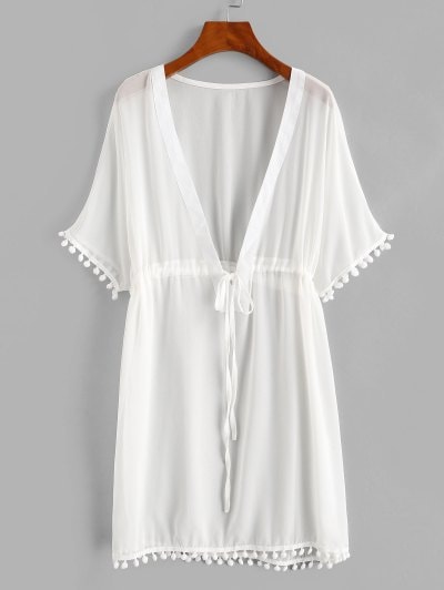 Drawstring Chiffon Pompoms Beach Dress