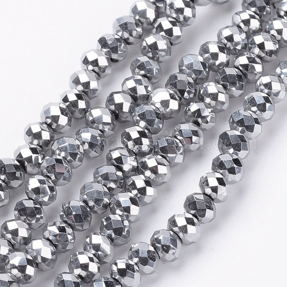 Electroplate Glass Bead Strands, Faceted, Rondelle, Platinum PlatedSize: about 4mm in diameter, 3mm thick, hole: 1mm; about 140~145pcs/strand, 18.1″.These glass beads have been electroplated metallic color on their surface which seems to be shiny and colorful. Electroplated glass beads are gaining popularity attributed to their affordable and gorgeous advantages.