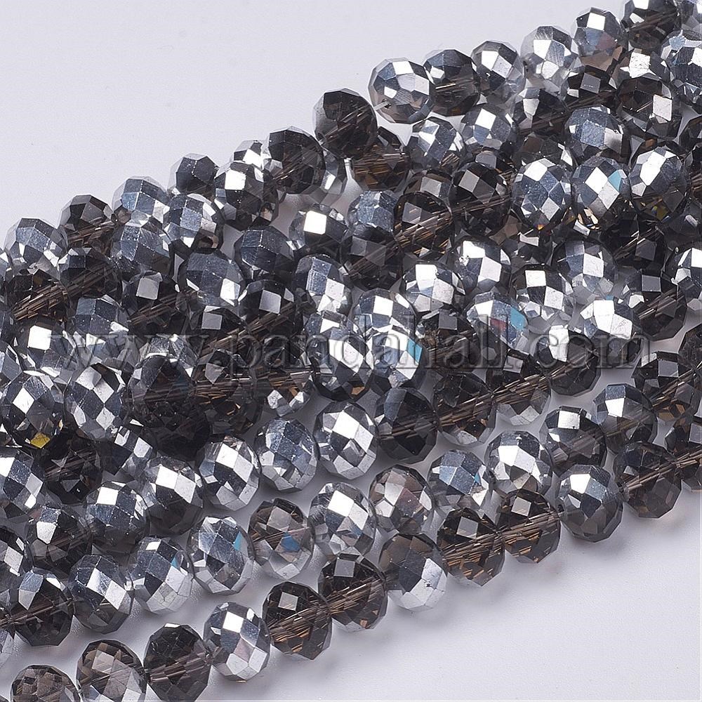 Electroplate Glass Bead Strands, Half Silver Plated, Faceted, Rondelle, CoffeeSize: about 10mm in diameter, 7mm thick, hole: 1mm; about 70~72pcs/strand, 19.8″.These glass beads have been electroplated color on their surface which seems to be shiny and colorful. We’d seen gradual changes in color that make different visual effect. Electroplated glass beads are gaining popularity attributed to their affordable and gorgeous advantages.