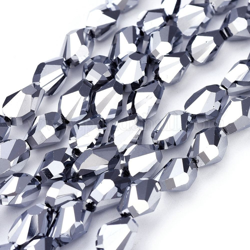 Electroplate Glass Beads Strands, Full Plated, Faceted, Teardrop, Platinum PlatedSize: about 7.5mm wide, 11~12mm long, 7.5~8mm thick, hole: 1.4mm; about 50pcs/strand, 22″(56cm).