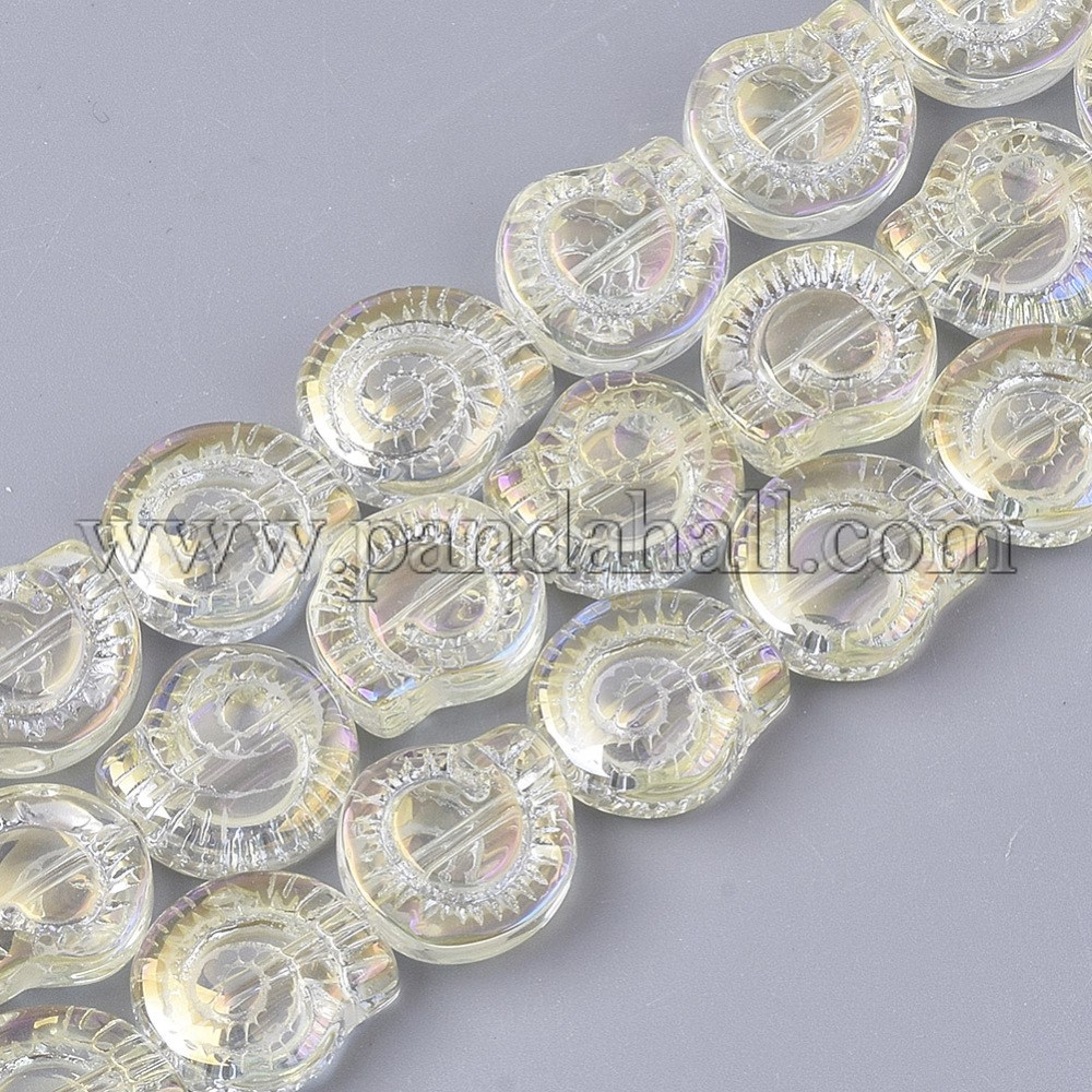 Electroplate Glass Beads Strands, Spiral Shell Shape, LightYellowSize: about 12mm long, 11.5mm wide, 4.5mm thick, hole: 1mm; about 50~51pcs/Strand, 24.41”(62cm).