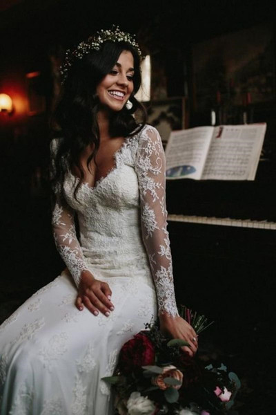 Elegant Summer Cheap Country Full Lace Wedding Dress V Neck Long Sleeve Applique Floral Beach Bridal Gowns berta bridal