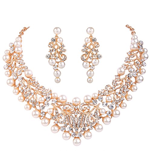 EVER FAITH Women’s Crystal Cream Simulated Pearl Vintage Style Wedding Necklace Earrings Set Gold-Tone
