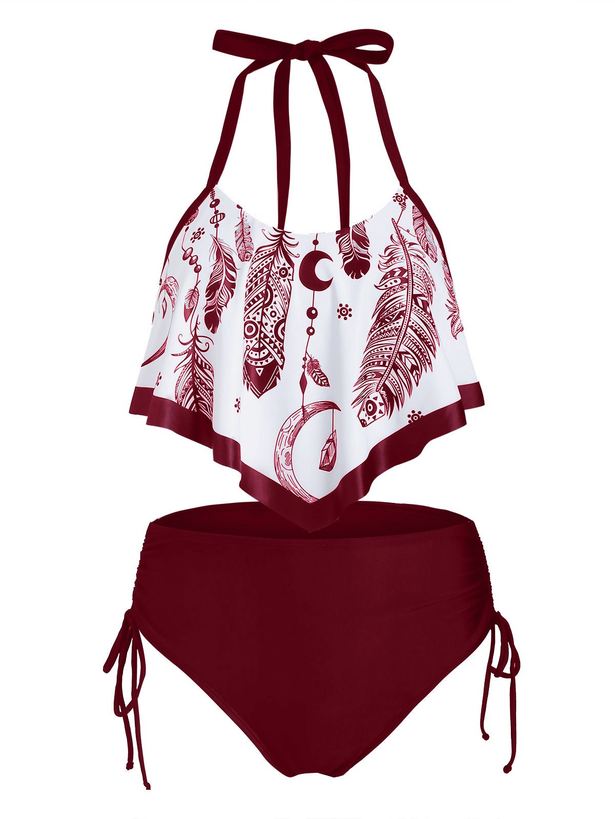 Feather Print Flounce Overlay Cinched Halter Tankini Swimsuit