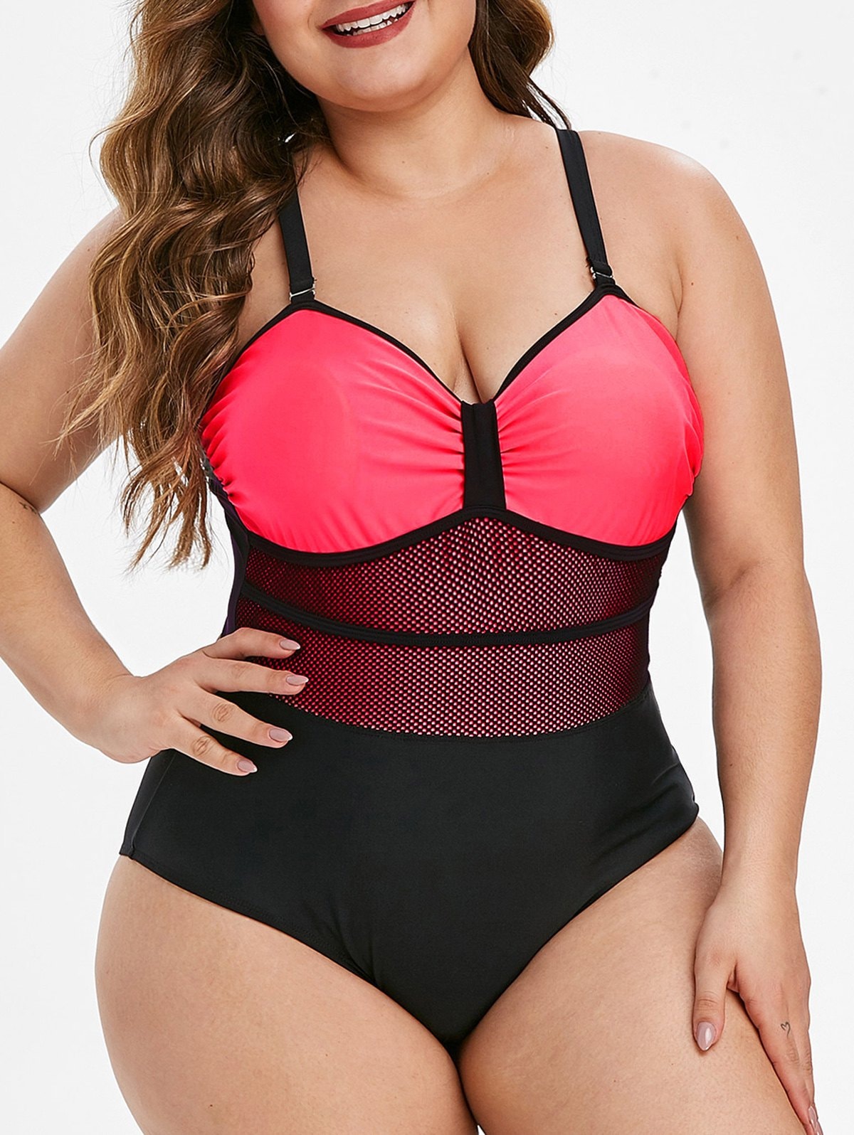 Fishnet Panel Colorblock Plus Size One-piece Swimsuit