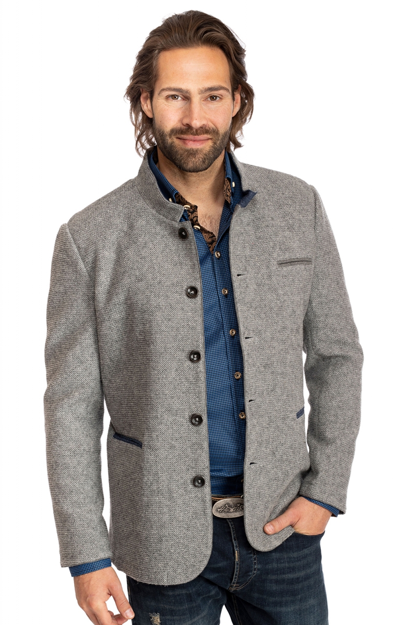 Stylish men’s jacket in grey / blue. The stylish men’s traditional jacket NARSBACH is presented in a rustic left knit. It has three pockets, of which the two are adorned with a blue edging in the hip area. The blue colour is repeated on the inside of the stand-up collar and on the tie. Otherwise, the jacket is kept in plain light grey. The elbows are covered with grey patches. The lined model keeps you warm thanks to the high wool content.