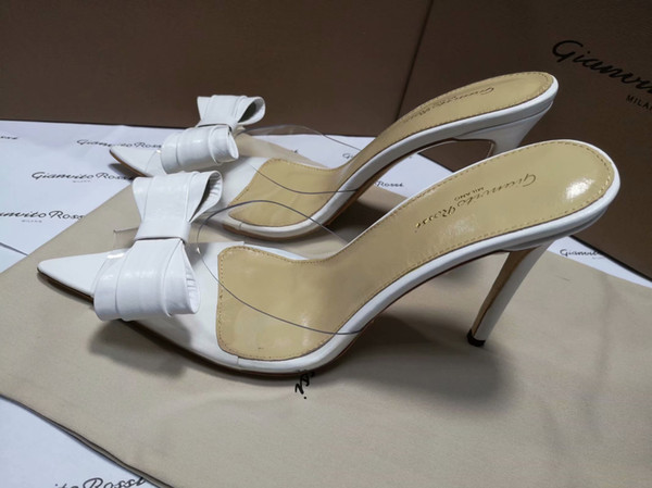 Gianvito Rossi White Sliver Black Bowtie Ladies Summer Mules Shoes High Heeled Female Dress Wedding Party PVC Sandals Slippers Women Zapatos