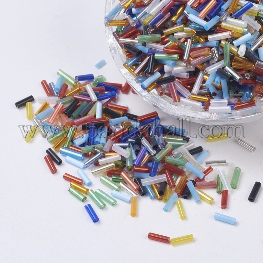 Glass Bugle Beads, Seed Beads, Mixed ColorSize: about 6mm long, 2mm wide, hole: 0.5mm, about 10000pcs/450gPriced per 1PoundQuick to loom and easy to string or sew, these seed beads provide you with an extensive alternative to conventional seed bead sizes. You”ll love how easy these beads are to work with. Their size is ideal for craft projects, cloth embellishment, and fun jewelry creations. These beads can also be combined with other style Seed Beads to add visual interest and depth to your projects. Mix and match for exciting results!